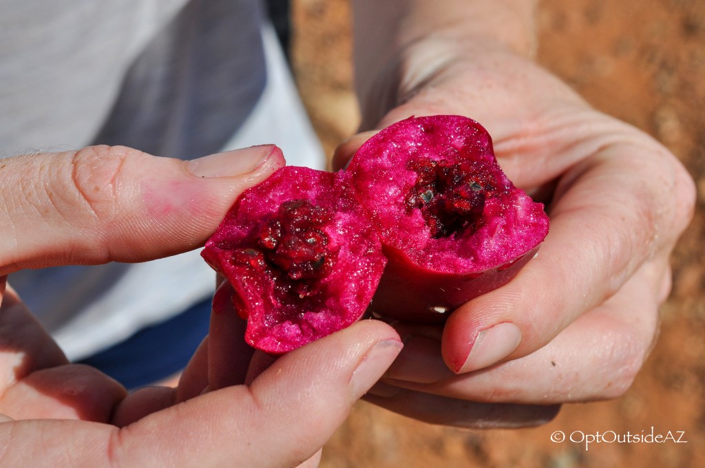 We hopped on Spur Cross heading east and took the quickie loop Fairy Duster which brings you up a tiny hill to provide an open view of the area. We sampled some prickly pear fruit (Opuntia engelmannii) because we could tell it was in season. You must be careful with the many spines, but this is delightful fresh and ripe.