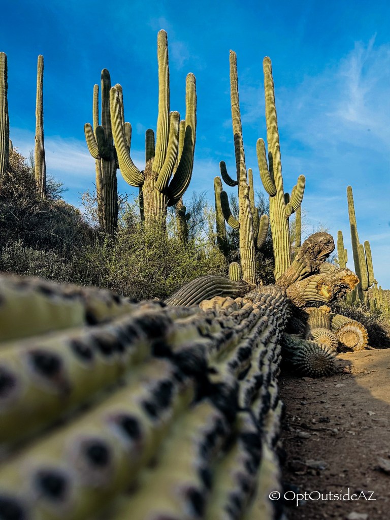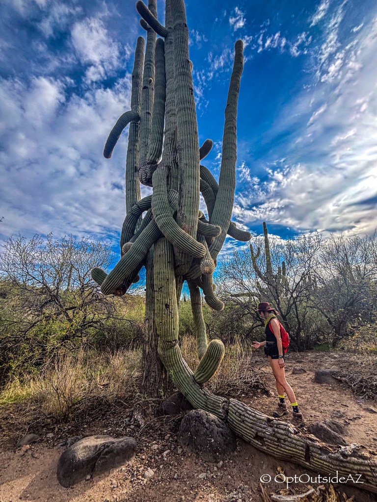 Continuing, these constant waters have allowed gigantic saguaros to grow and two mesquite bosques to thrive. This type of bosque is known to draw in and keep moisture within an area, so it is particularly beneficial to exist in drought-prone locations. Some of the saguaro (Carnegiea gigantea) are so massive! It is quite the experience to weave through a grove of so many mature and immense saguaro.