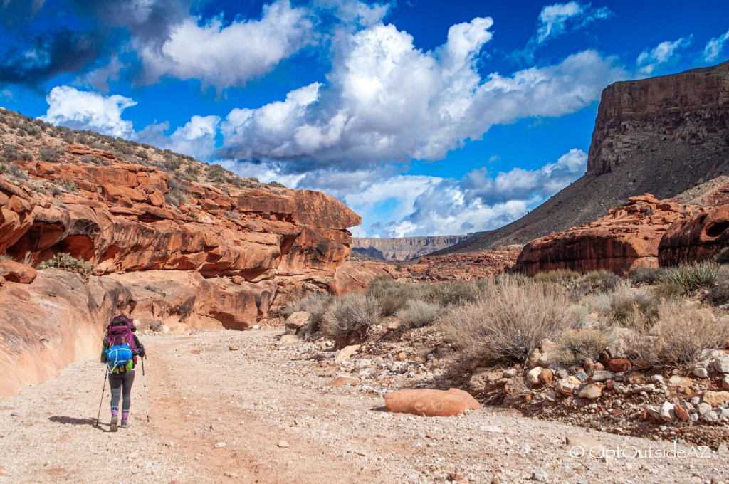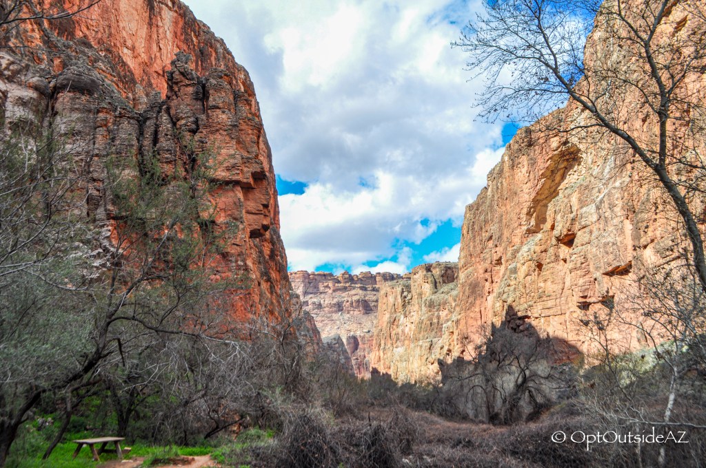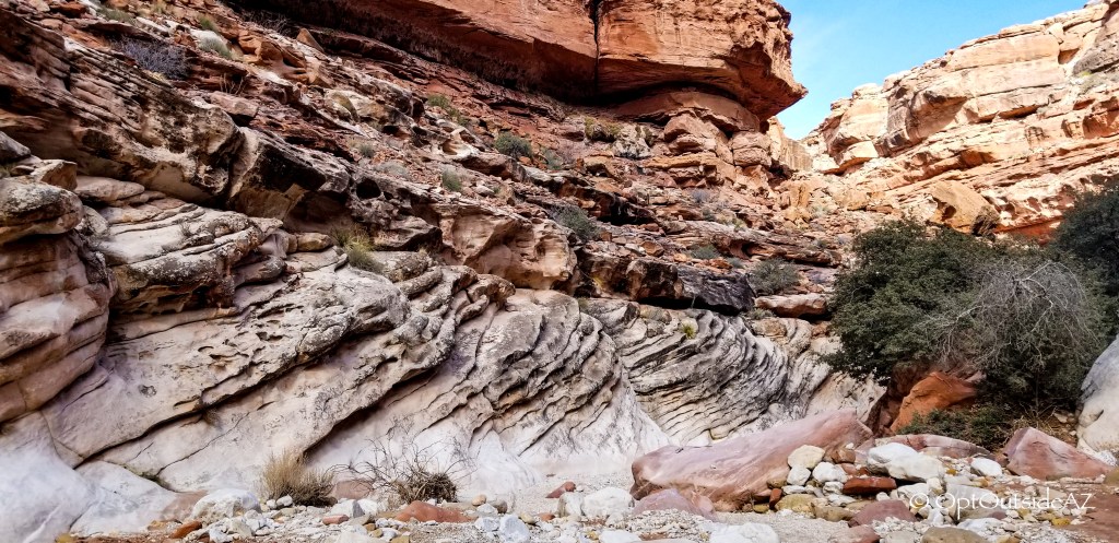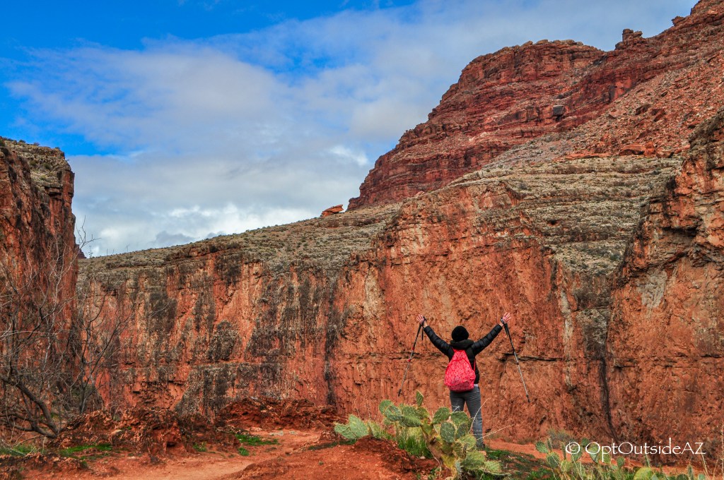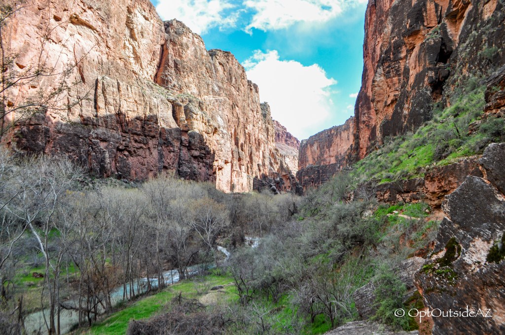 After you get down this steep section, the next section is long, bare, and a gradual descent. But what a beautiful area to admire. Thankfully, we had clouds, because even though it was February, it is still Arizona, and our sun is intense. The mountain walls will eventually start to rise as you push forward, revealing nice spots for a reprieve or a snack. Once clusters of vegetation change and thicken, this indicates you are getting closer to water.