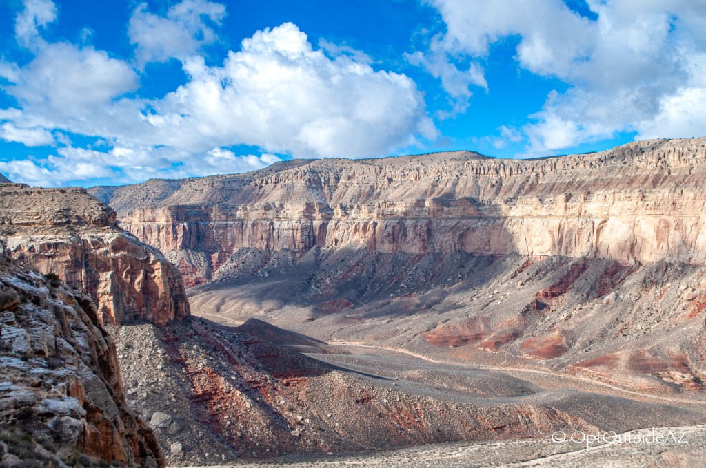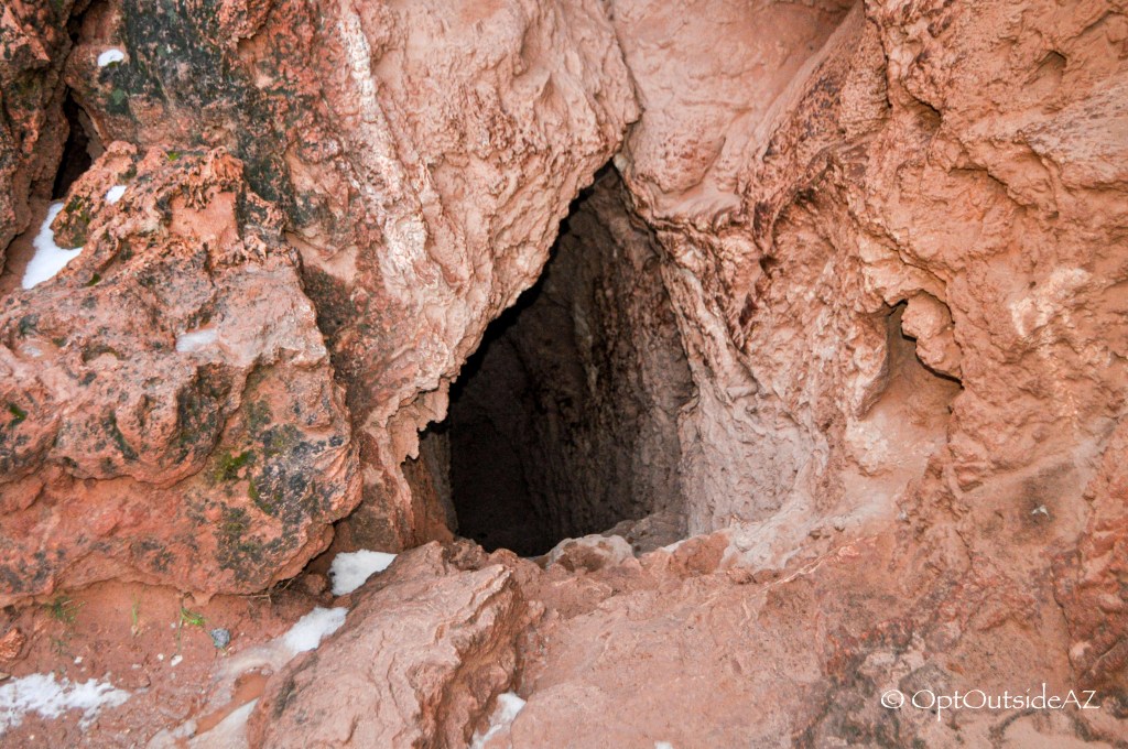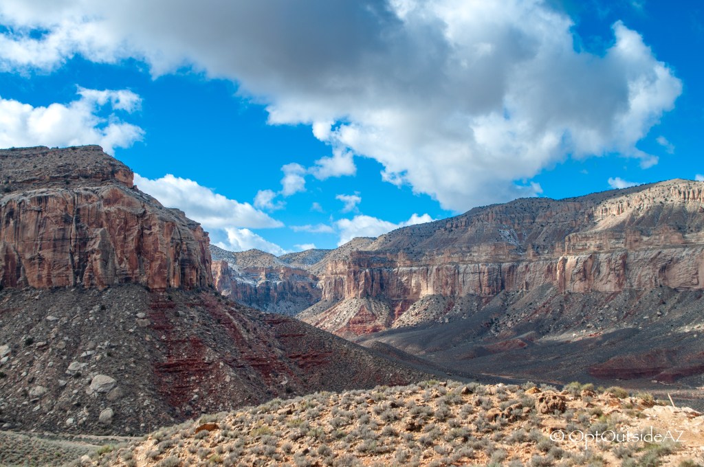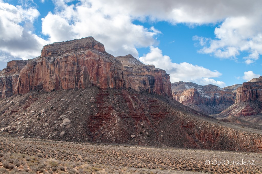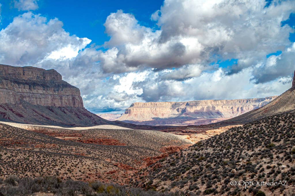 After you get down this steep section, the next section is long, bare, and a gradual descent. But what a beautiful area to admire. Thankfully, we had clouds, because even though it was February, it is still Arizona, and our sun is intense. The mountain walls will eventually start to rise as you push forward, revealing nice spots for a reprieve or a snack. Once clusters of vegetation change and thicken, this indicates you are getting closer to water.
