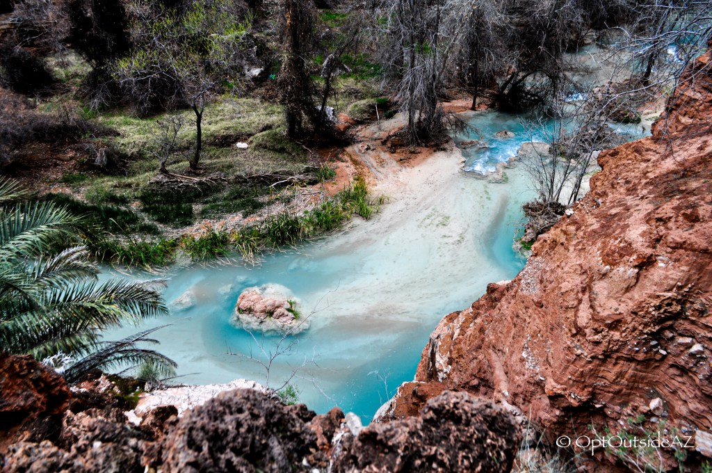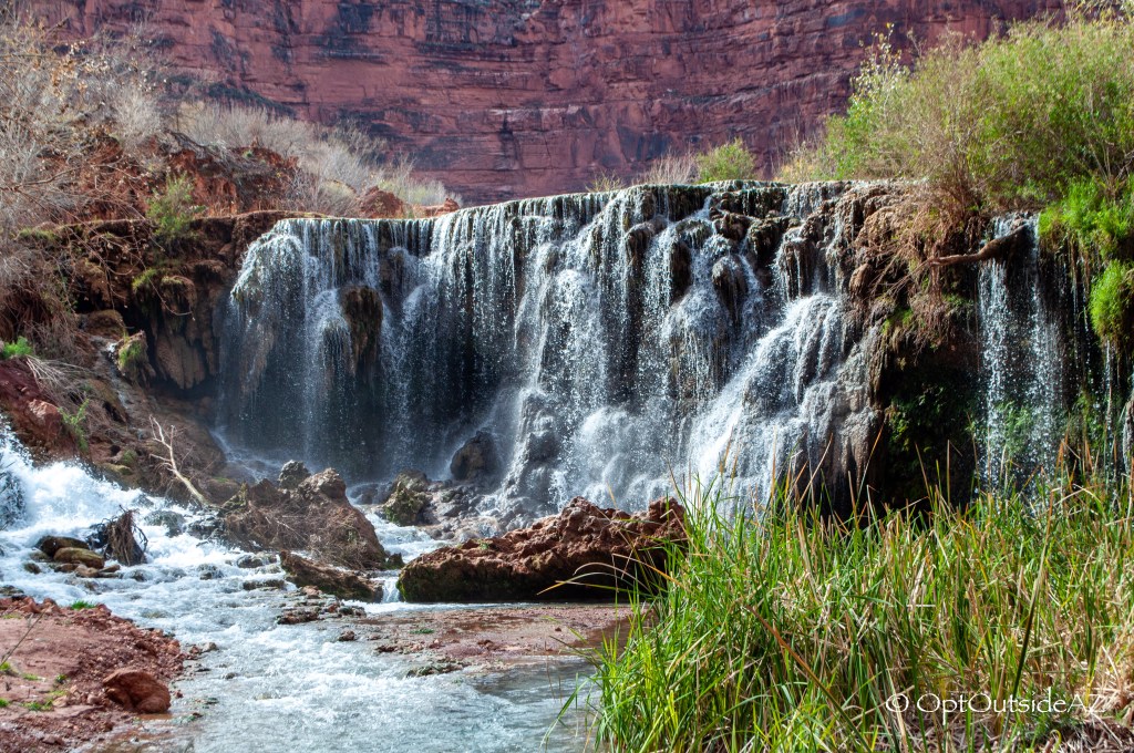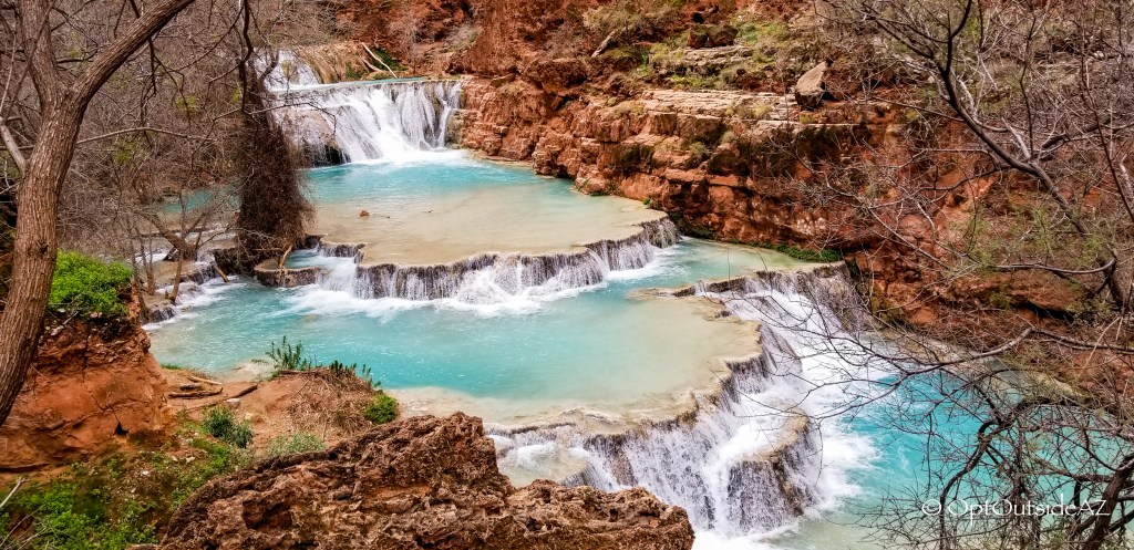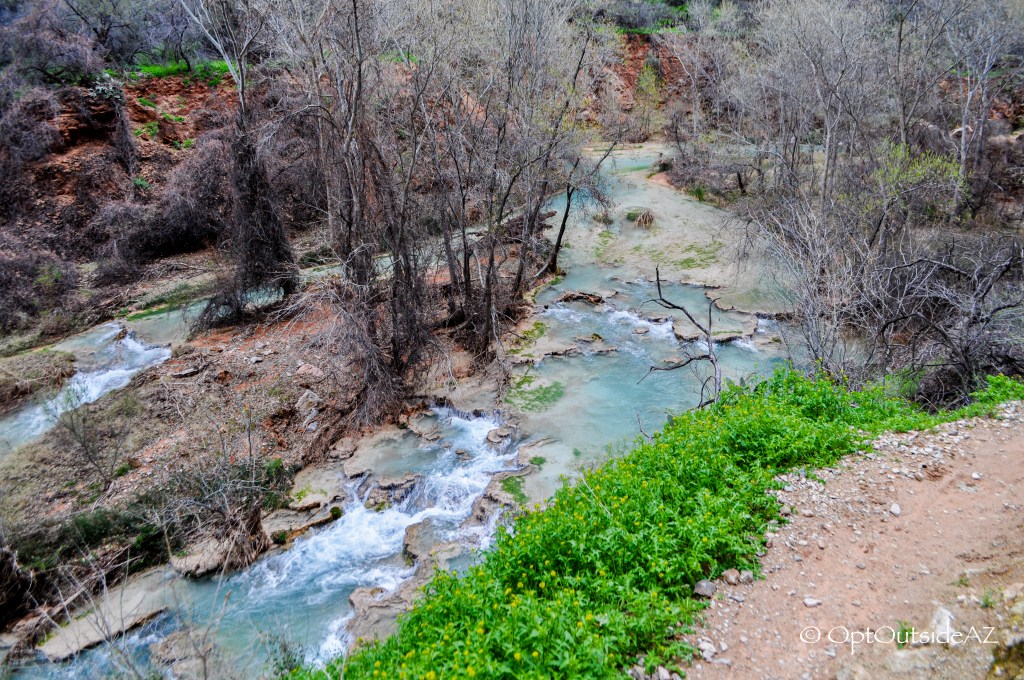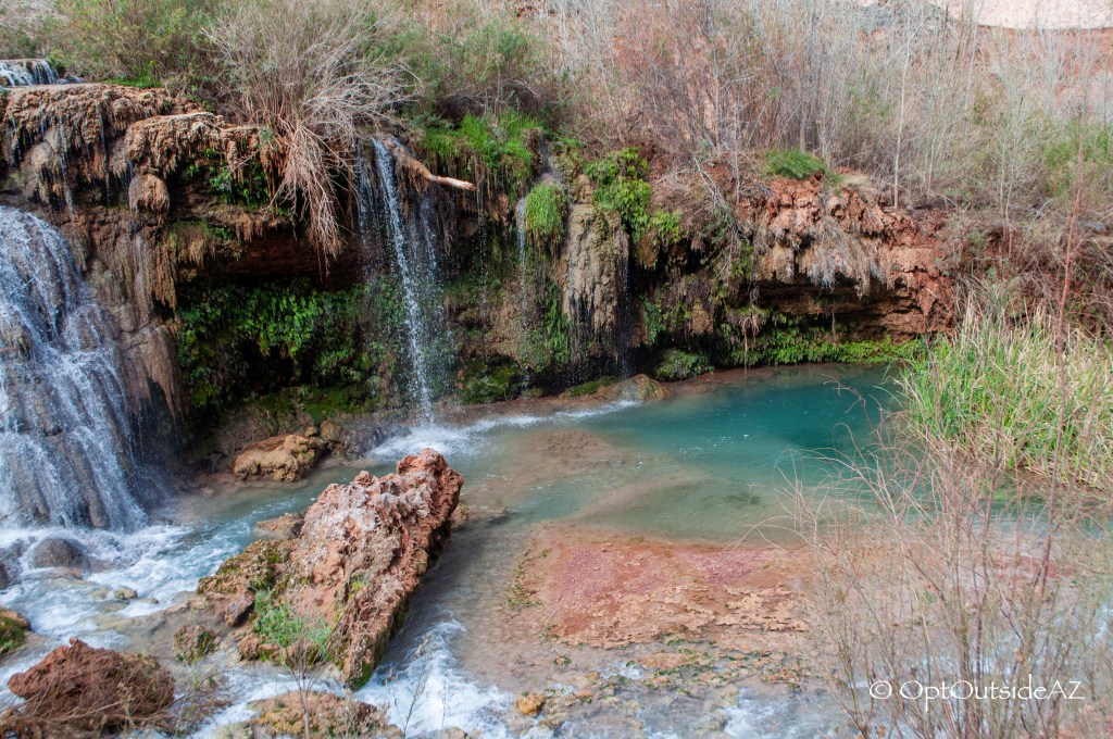 The next series of waterfalls are New Navajo Falls and Fifty Foot Falls. Back in 2008, a massive summer monsoon changed the path of Havasu Creek and reshaped what we know today as New Navajo Falls. Even more of a reason to see this wonder as it is now, before the changes that will eventually occur. These are different and pretty; I love the constantly changing stalagmites hanging at the crest of at Fifty Foot, and enjoy the views/lunch spot from New Navajo Falls. No swimming on this day, but is ideal in the summer!