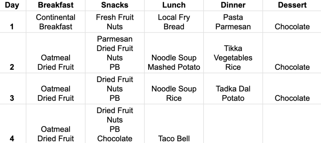Breakfasts and lunch were easy: rehydrating dried Goji berries in oatmeal was a newly discovered nutritional delight, and any time I needed an energy boost, the Justin’s Peanut Butter packets gave me what I needed. Prioritizing completing the leftover parmesan first, we varied our snacks with these plus other dried fruit, nuts, and remaining chocolate. The flavored hydration packets were a nice deviation to refresh and hydrate the palate. Lunch would be a noodle soup with either rice or potatoes to accompany (if necessary). Since adventure was our primary focus, we wanted our day-food to be quick and functional.