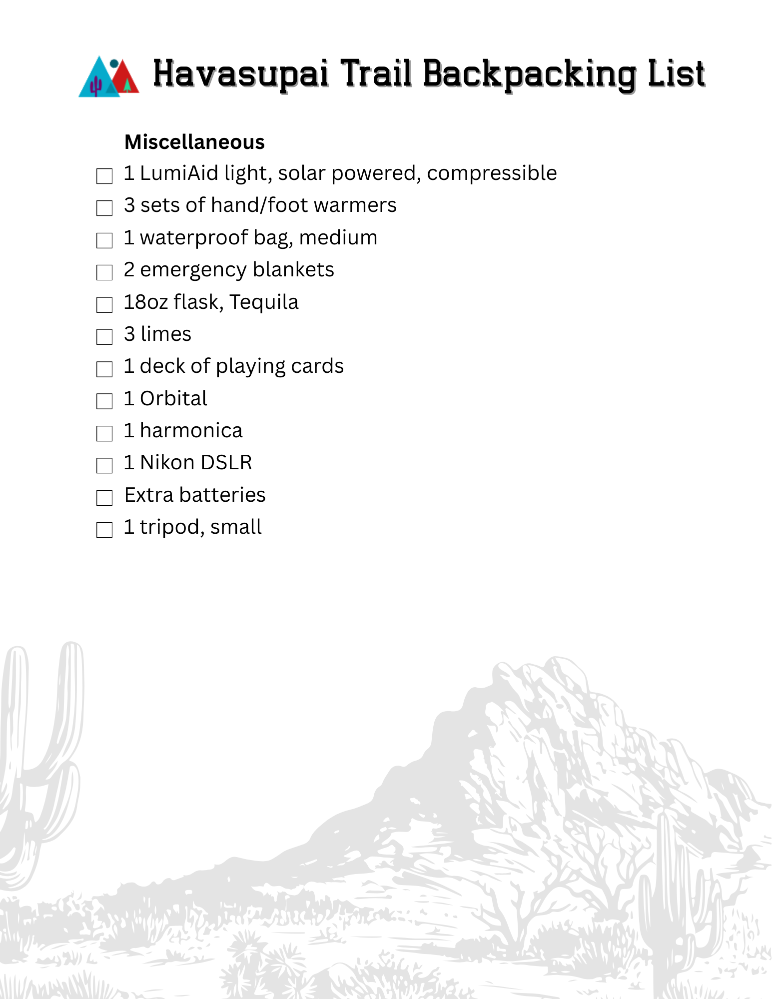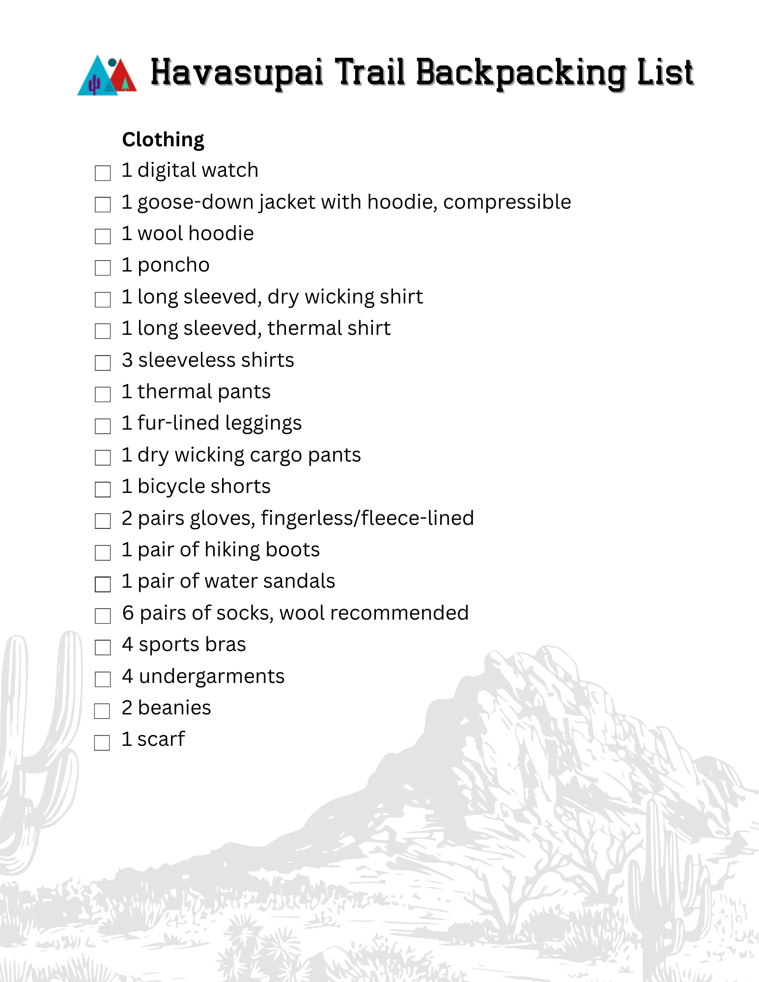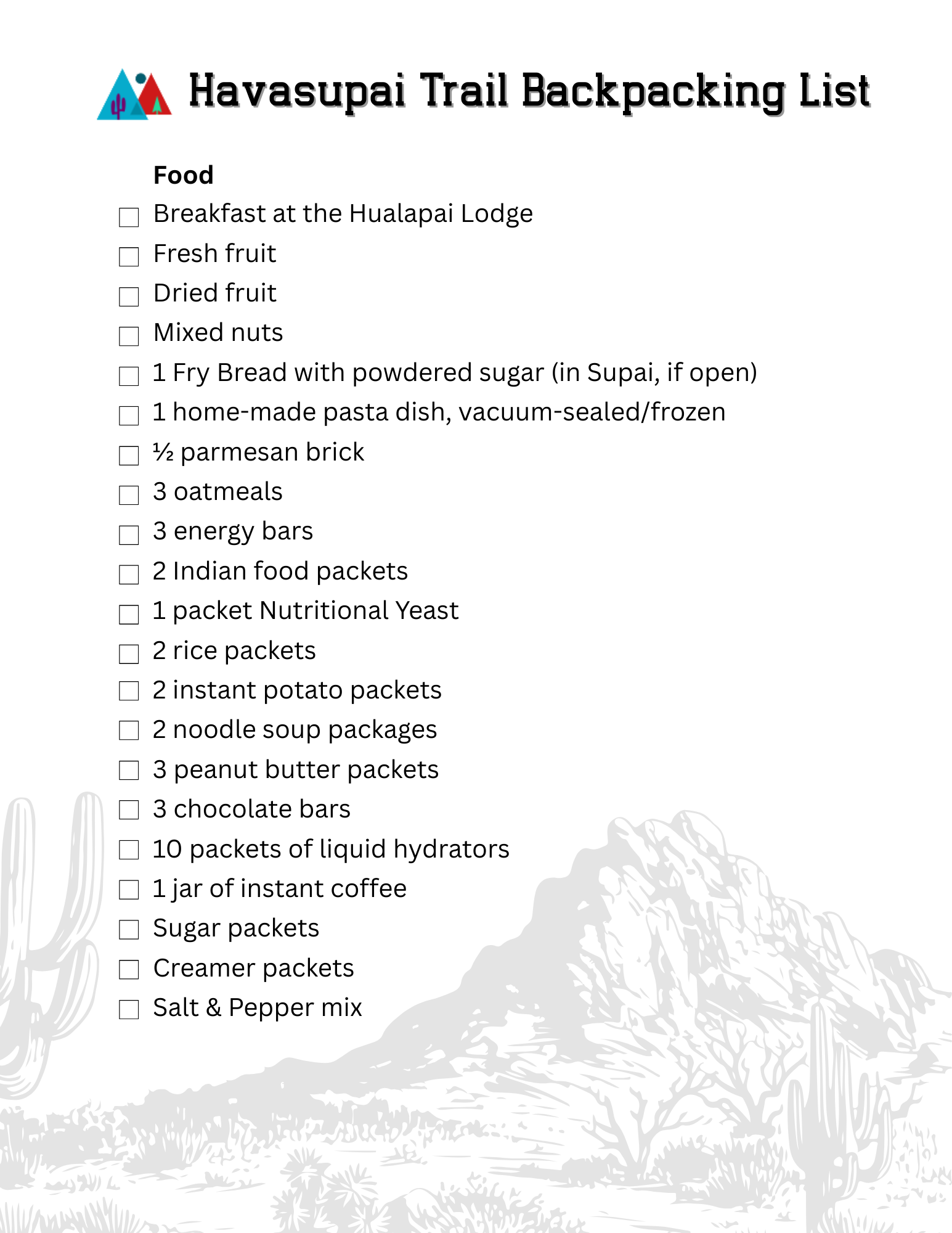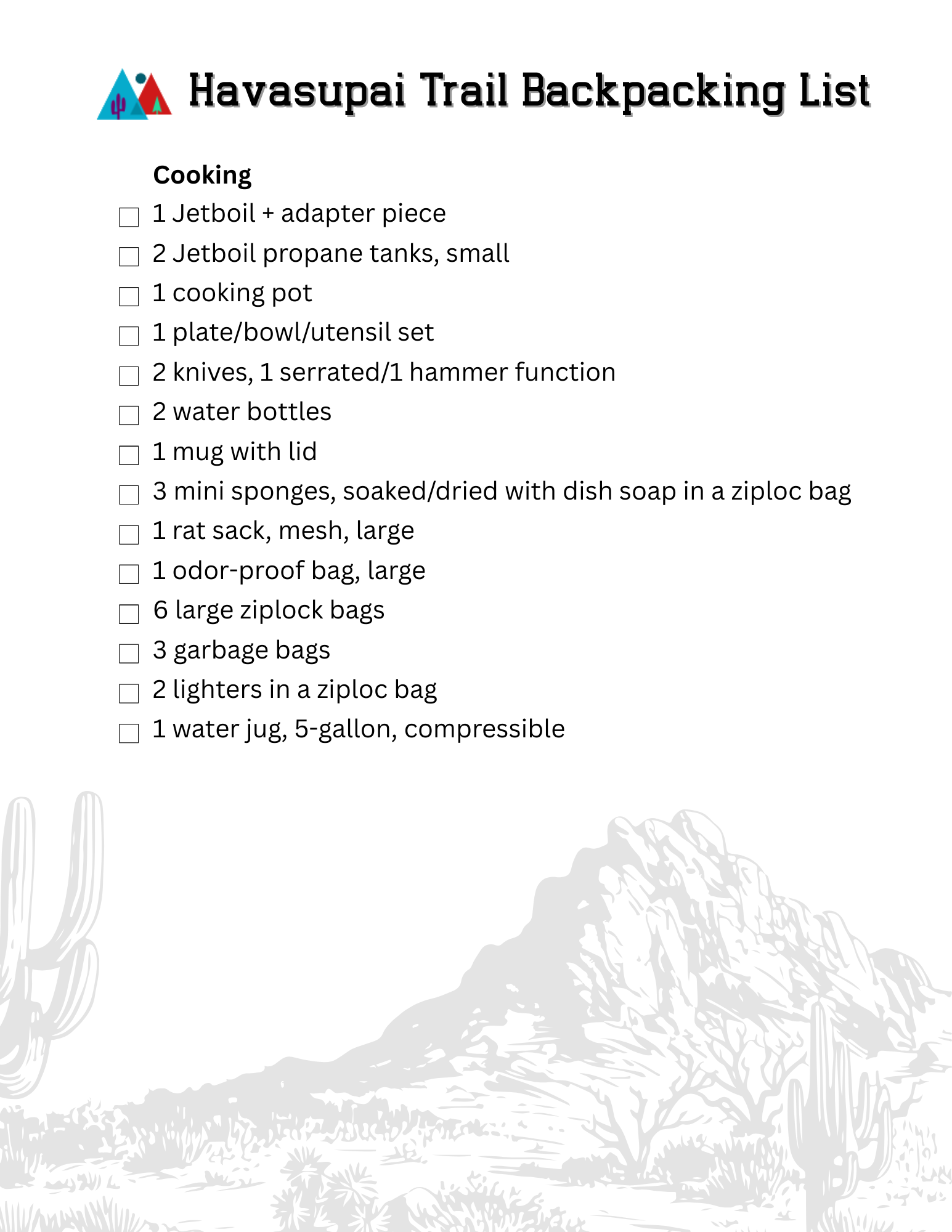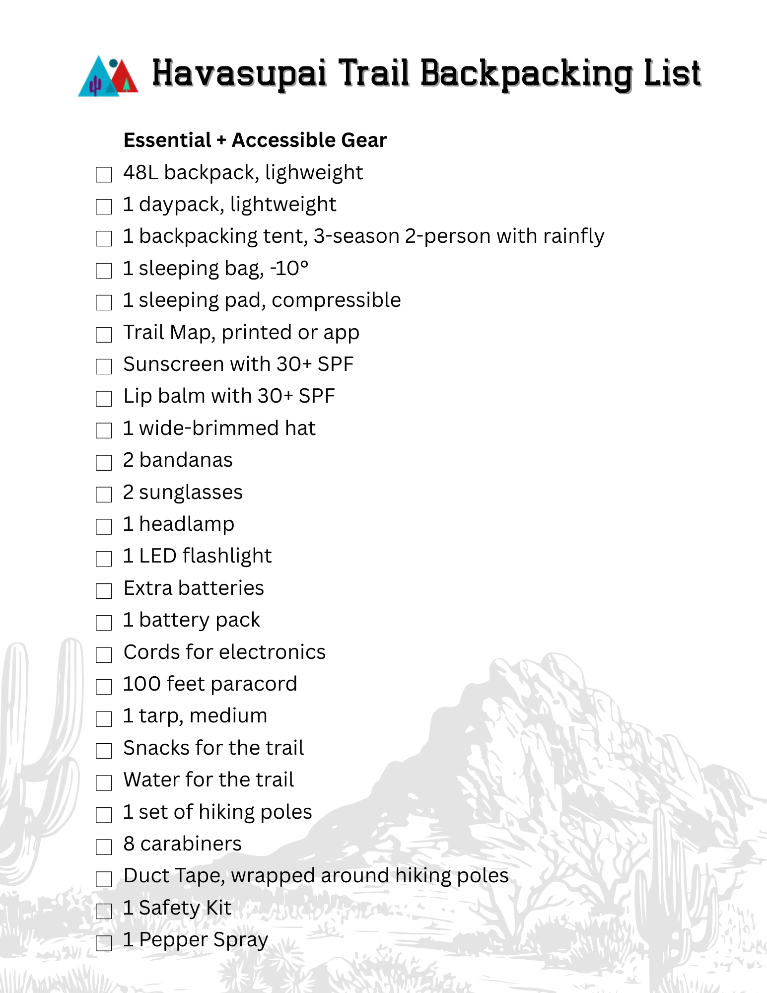 We hope these lists help you prepare for your upcoming backpacking trip. Use this as a reference for a multiple-day adventure that has access to clean water and primarily agreeable weather, like the trek to Havasupai Campground. To access the PDFs, Subscribe below.